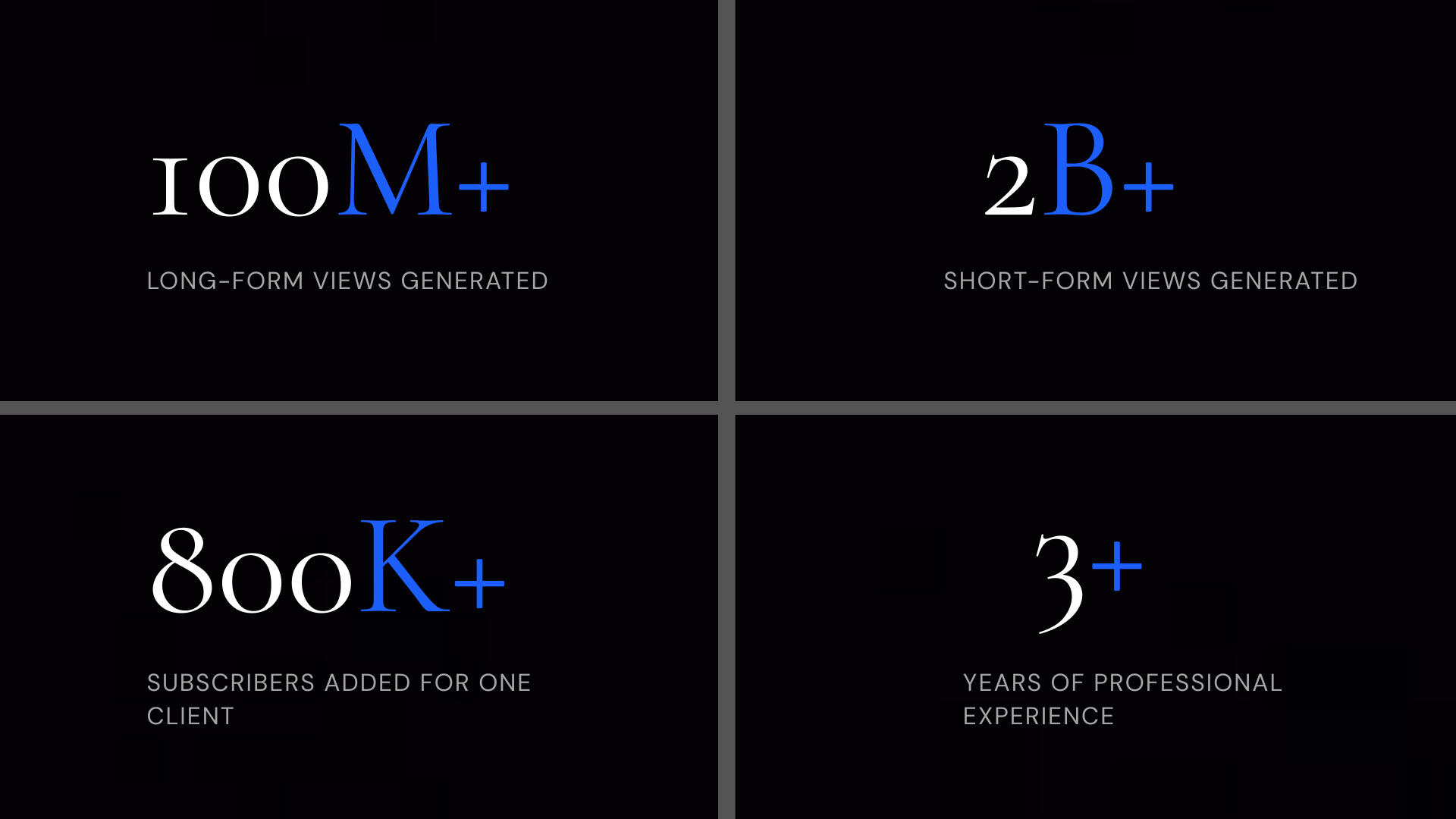 My writing journey began at 16, when I started writing product listings and website content for my dad's company.From 18 to 20, I built and ran my own Shopify drop-shipping business, producing high-converting, SEO-optimized product descriptions.After selling the business at 20, I to YouTube, where my background in concise, conversion-focused writing translated naturally into writing scripts designed to maximize retention and viewer engagement.Now, with over 3 years of scriptwriting with proficient in content ideation and strategy, I have developed a track record of scripting videos that outperform channel averages and go viral.